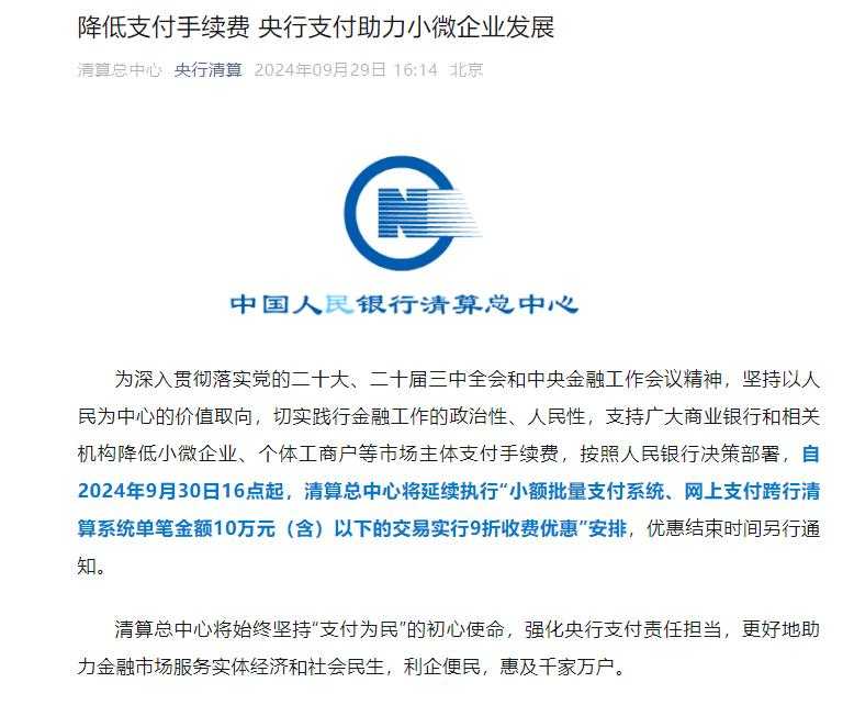 中国人民银行清算总中心公告,自2024年9月30日起,将继续对小额批量支付系统、网上支付跨行清算系统中单笔金额10万元(含)以下的交易实行9折收费优惠,优惠结束时间另行通知。