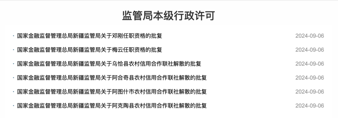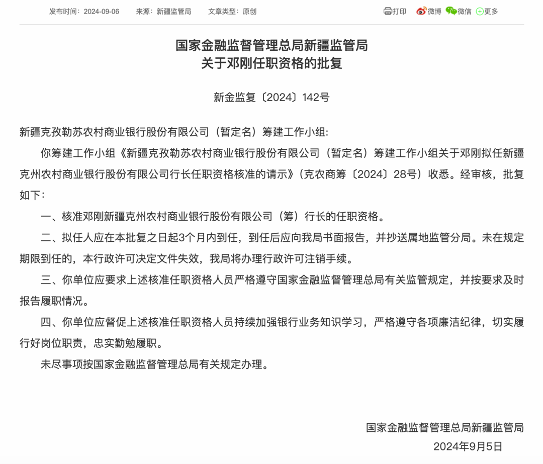 9月6日,金融监管总局在其官方网站上公布了最新的批复文件,文件指出,阿图什市、阿克陶县、阿合奇县以及乌恰县的农村信用合作联社,因合并组建新疆克州农商银行而正式获批解散。与此同时,新疆克州农商银行董事长梅云及行长邓刚的任职资格也已获得核准。