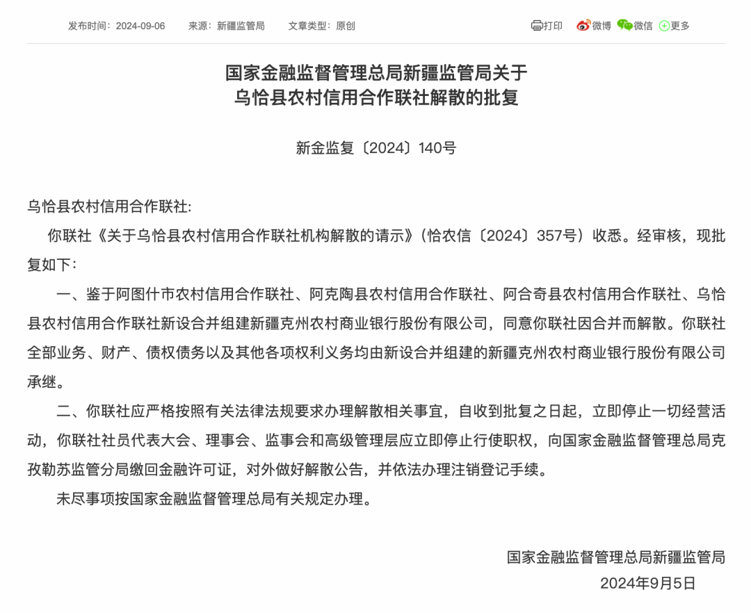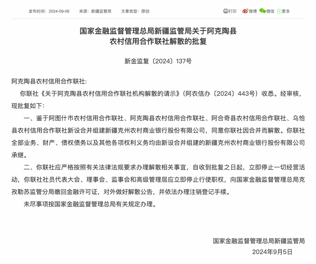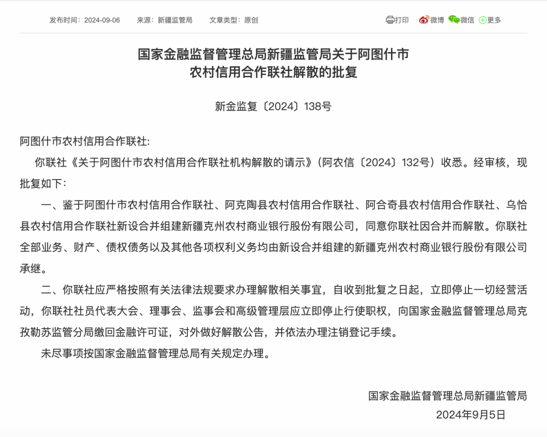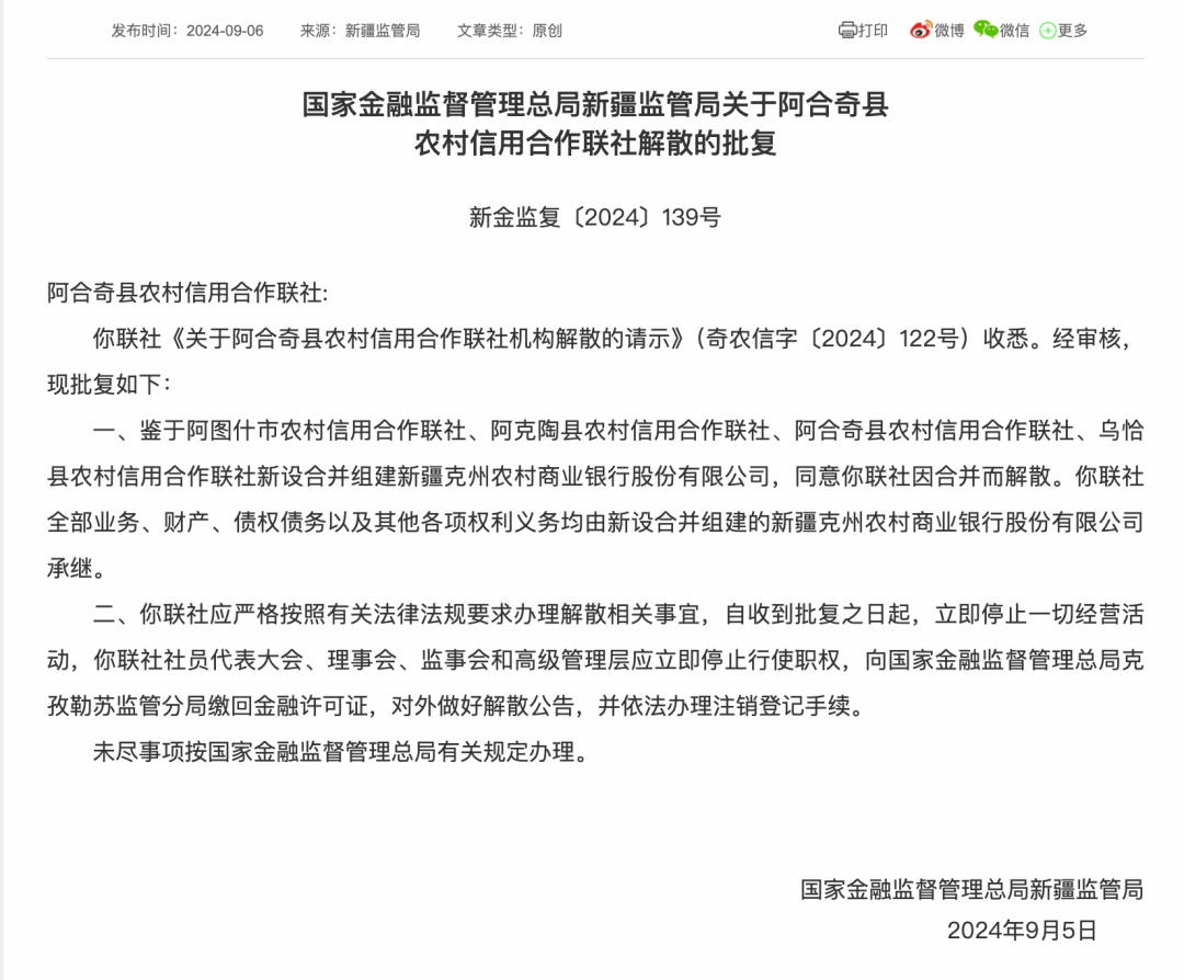 根据批复文件内容,四家农村信用合作联社因合并组建新疆克州农商银行而被同意解散,其所有业务、财产、债权债务及其他各项权利义务,均将由新设的新疆克州农商银行承继。新疆监管局明确要求四家联社自收到批复之日起,立即停止一切经营活动,并依法办理注销登记等相关事宜。