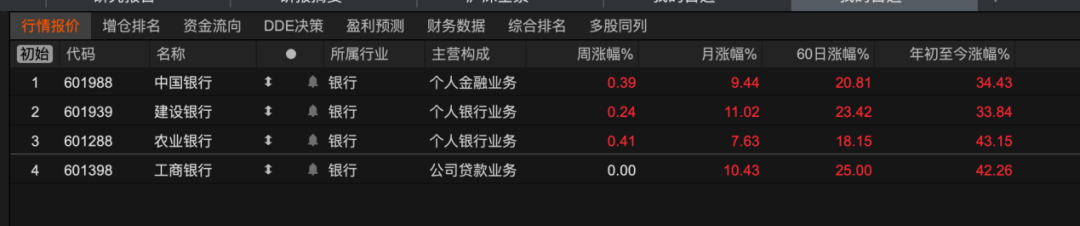 今年以来,银行股整体表现出色,成为大盘的领涨力量。据统计,年初至今,农业银行涨幅位居四大行之首,达到43.15%;工商银行、中国银行、建设银行紧随其后,涨幅分别为42.26%、34.43%和33.84%。