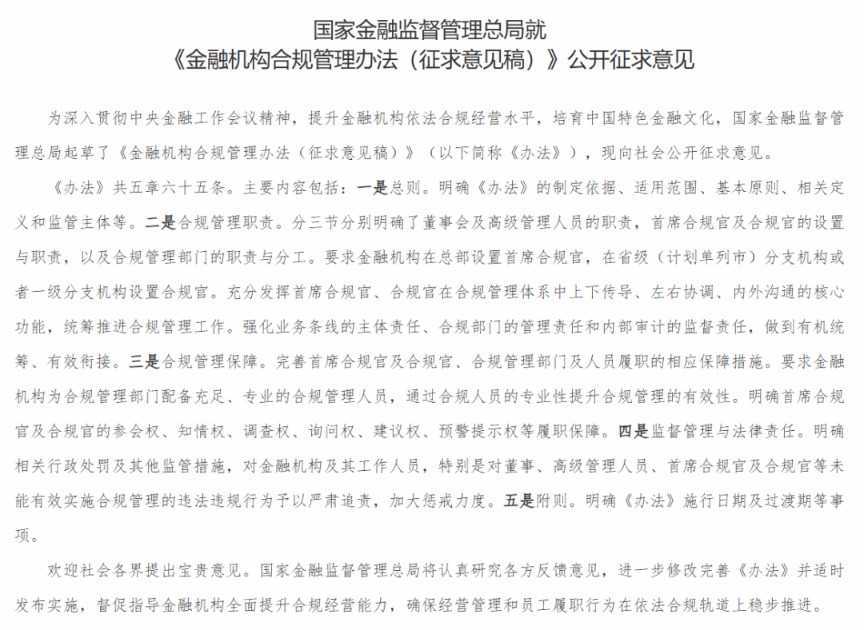 8月16日,金融监管总局正式发布了《金融机构合规管理办法(征求意见稿)》(以下简称《办法》),并公开征求社会各界意见。