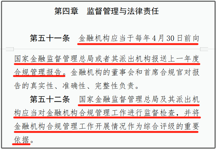 在监督管理与法律责任方面,《办法》明确了相关行政处罚及其他监管措施,对金融机构及其工作人员,特别是对董事、高级管理人员、首席合规官及合规官等未能有效实施合规管理的违法违规行为予以严肃追责,并加大惩戒力度。此外,《办法》还要求金融机构每年向国家金融监督管理总局或其派出机构报送上一年度合规管理报告,并由董事会和首席合规官对报告的真实性、准确性、完整性负责。