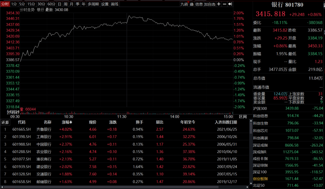 7月23日,申万一级银行板块收盘报3415.818点,涨幅0.86%。其中,超过七成的银行股呈现上涨态势。齐鲁银行、工商银行、中国银行、农业银行、渝农商行及建设银行涨幅均超过2%,齐鲁银行更是以4.02%的涨幅位居榜首,收盘价4.66元,盘中最高价达4.75元,换手率0.94%,年内累计涨幅超20%。