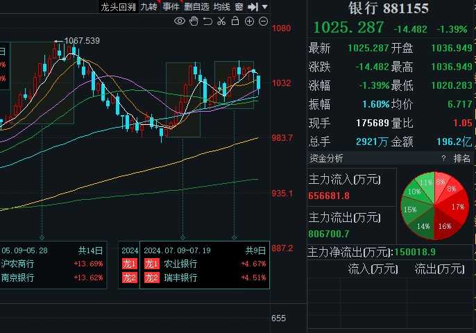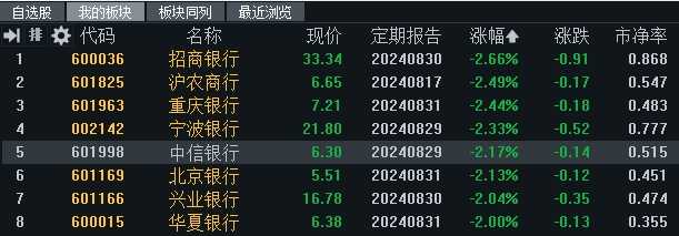 截至收盘,虽然银行股有所回升,整体跌幅收窄至1.39%,但个股依然未能翻红。招商银行、沪农商行、重庆银行、宁波银行、中信银行、北京银行、兴业银行、华夏银行等8家银行股价跌幅均在2.0%及以上,市场反应强烈。