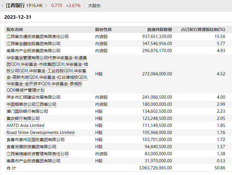 根据年报数据,该行股权结构清晰,其中江西省高速公路投资集团以15.56%的持股比例稳坐第一大股东之位,江西金融集团持股5.77%,南昌产业投资持股4.81%,中国烟草总公司江西省公司持股4.37%,江西省投资集团持股2.99%。