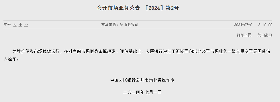 人民银行网站7月1日正式发布消息,为确保债券市场的平稳运行,经过对当前市场状况的细致观察与综合评估,人民银行已决定在近期内,针对部分公开市场业务的一级交易商,启动国债借入操作。这一决策旨在通过宏观调控手段,进一步优化债券市场的资源配置。