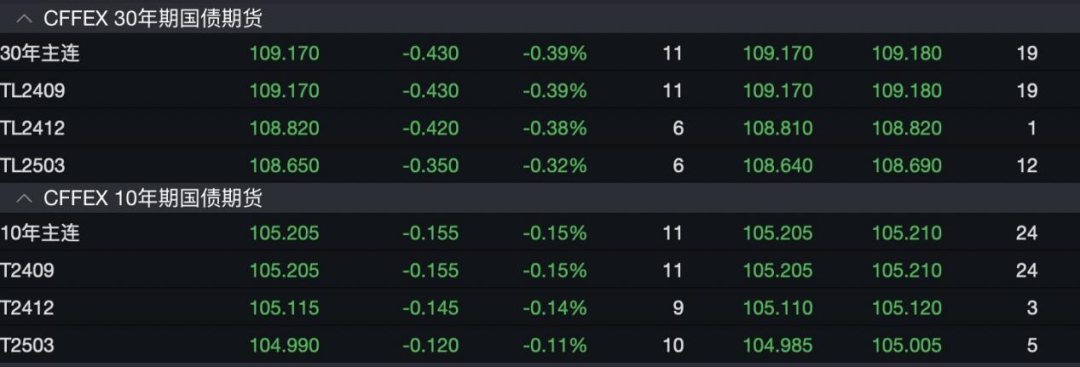 消息发布后,国债期货市场迅速作出反应,出现显著下挫。具体数据显示,截至报道发出,30年期与10年期国债期货的主力合约分别急剧下跌0.39%与0.13%。同时,银行间利率债活跃券的收益率下行趋势减缓,其中30年期国债活跃券230023的收益率转而上升0.15个基点,报至2.4250%;10年期国债活跃券240004的收益率则收窄至2.2200%。