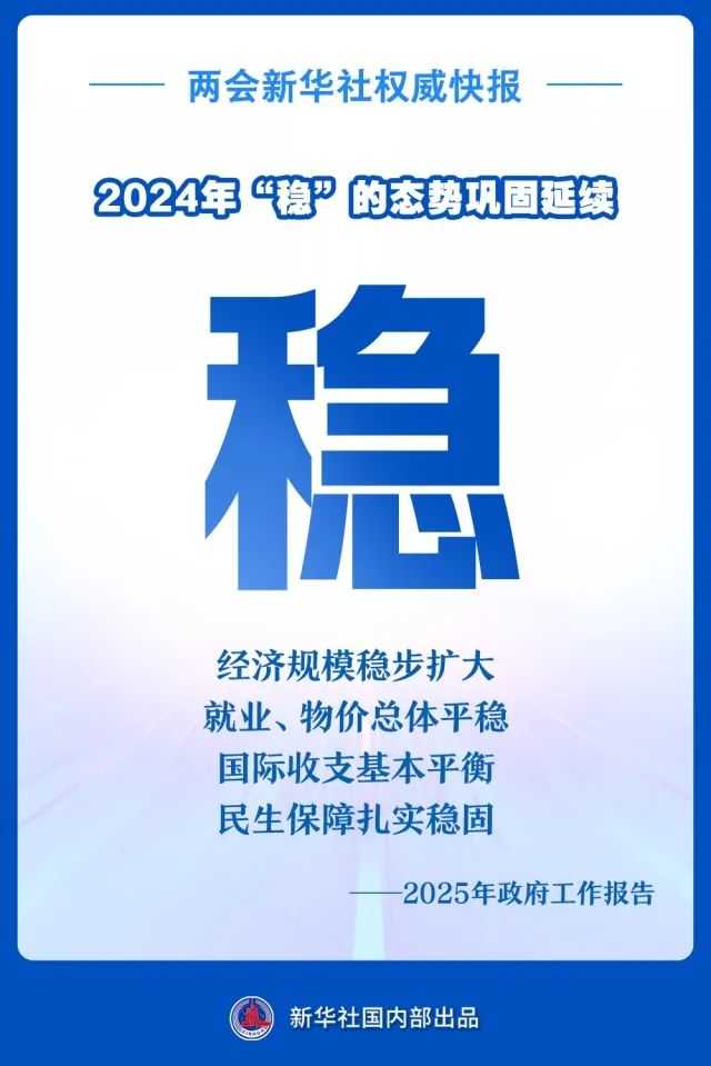 政府工作报告强调,2024年,我国经济“稳”的态势得以巩固。经济规模扩大,国内生产总值达到134.9万亿元、增长5%,对全球经济贡献显著。就业、物价平稳,对外贸易创历史新高,民生保障稳固,风险化解有效,社会大局稳定。
