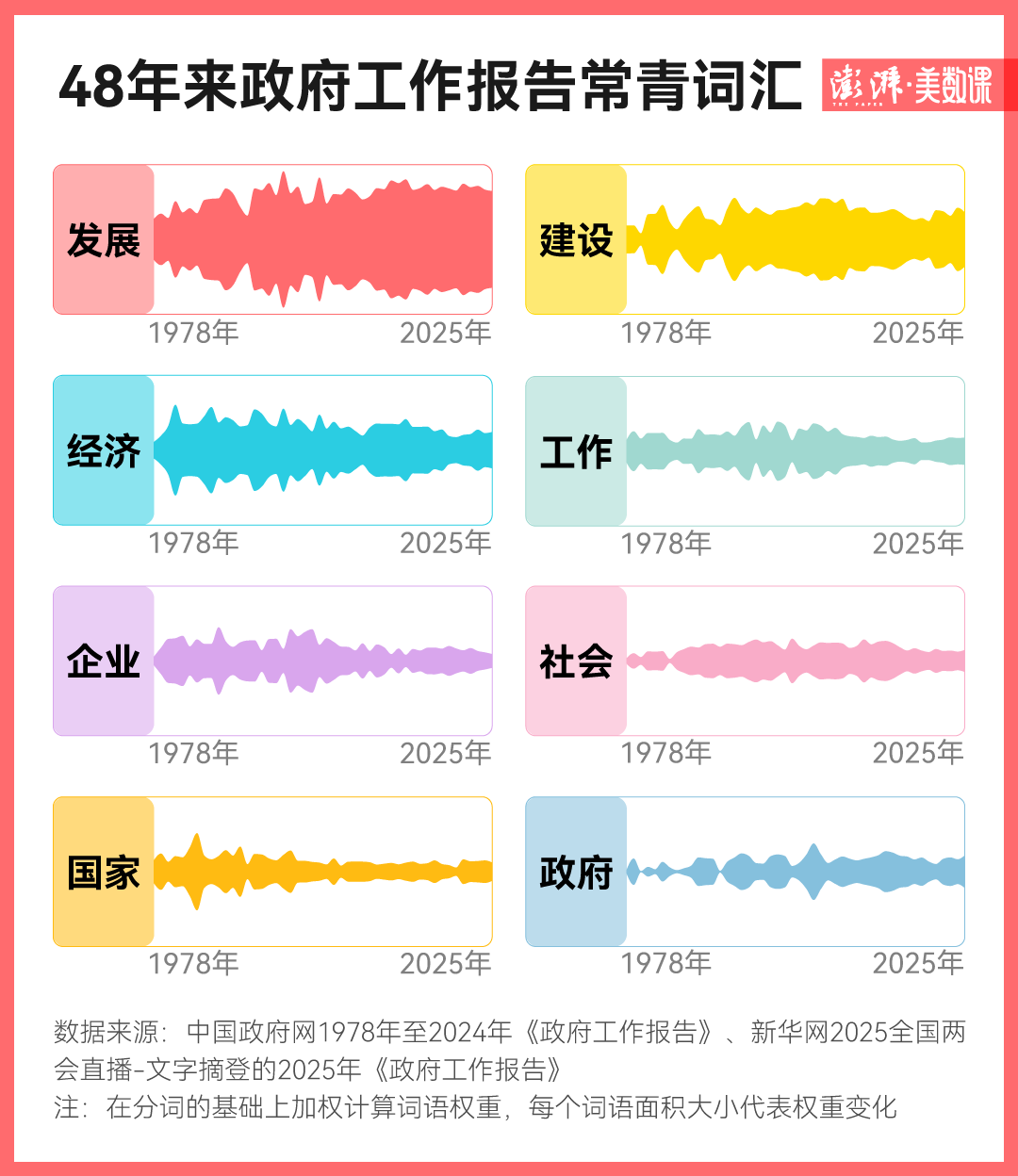 结合1978年至2024年《政府工作报告》的历史数据,“发展”“建设”及“经济”持续高频出现,成为历年报告的关键词。