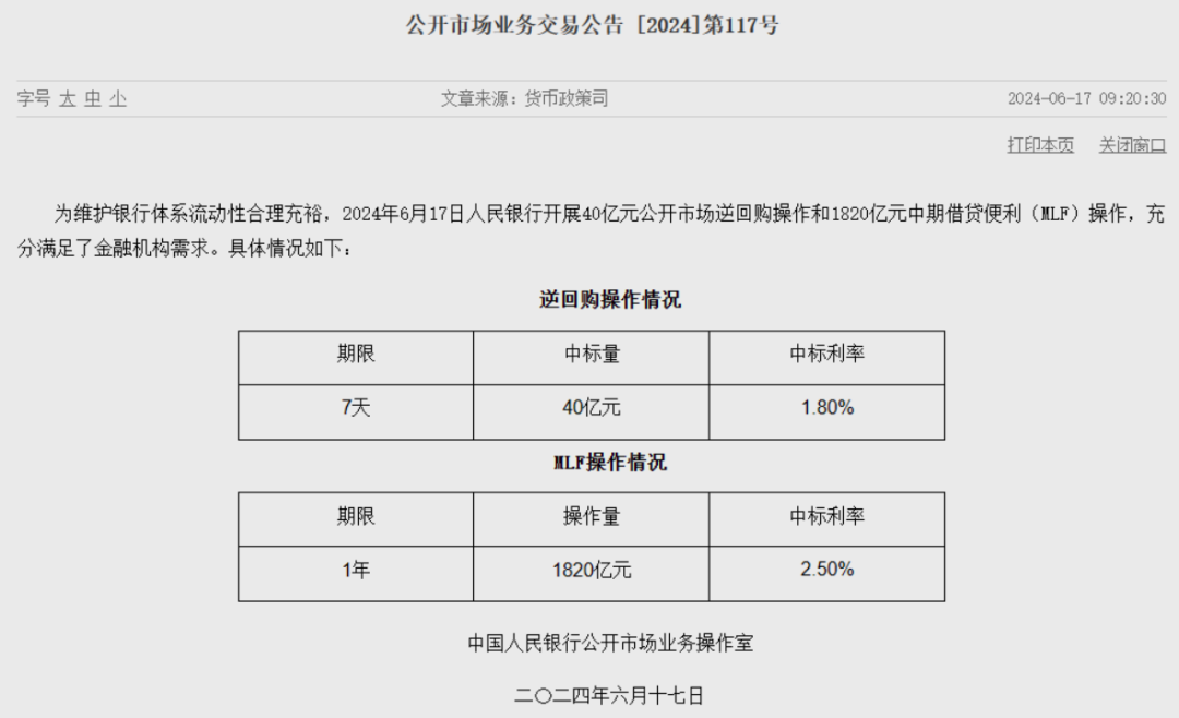 6月17日,人民银行(央行)为维护银行体系流动性合理充裕,采取了40亿元的公开市场逆回购操作和1820亿元的中期借贷便利(MLF)操作。其中,7天期逆回购中标利率维持在1.8%,MLF中标利率则保持在2.5%,均未发生变化。