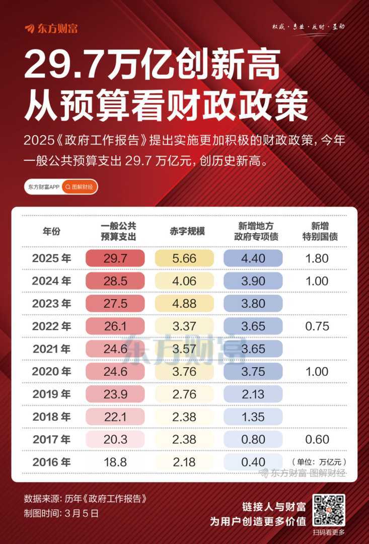 政府工作报告明确今年实施更积极的财政政策,统筹安排收入、债券等财政资金,一般公共预算支出29.7万亿元,赤字率提高至4%,赤字规模5.66万亿元,地方政府专项债4.4万亿元,特别国债1.3万亿元。