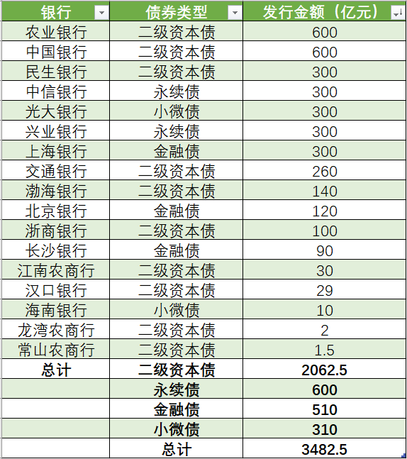 从发债银行类别来看,国有大行在债券发行中占据了主导地位,3家国有大行共发行债券1460亿元,占比41.92%,且全部为二级资本债。此外,6家全国性股份制商业银行发行了1440亿元债券,占比41.35%;5家城商行发行了549亿元,占比15.76%;而3家农商行则仅发行了33.5亿元,占比不到1%。