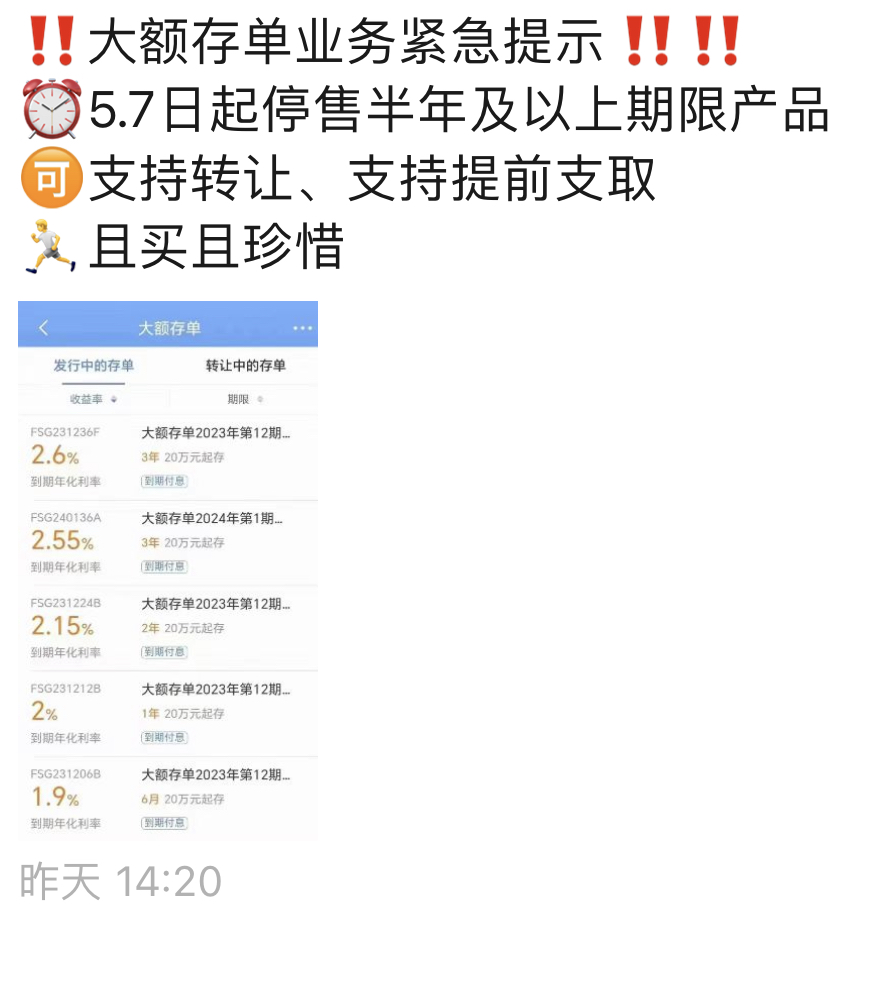 “大额存单业务紧急提示!民生银行北京某支行5月7日起停售半年及以上期限产品,客户需抓紧购买!”该支行客户经理小王向记者透露。