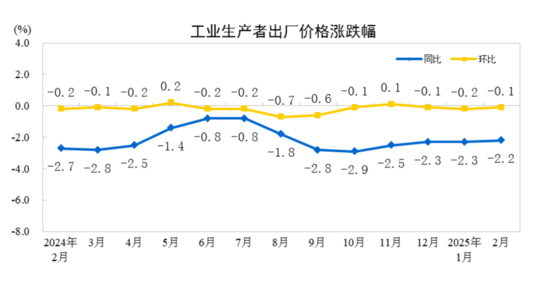 数据显示,2月份,PPI同比下降2.2%,环比下降0.1%,降幅比上月均收窄0.1个百分点。1—2月平均,PPI比上年同期下降2.2%。