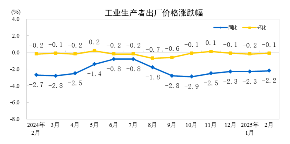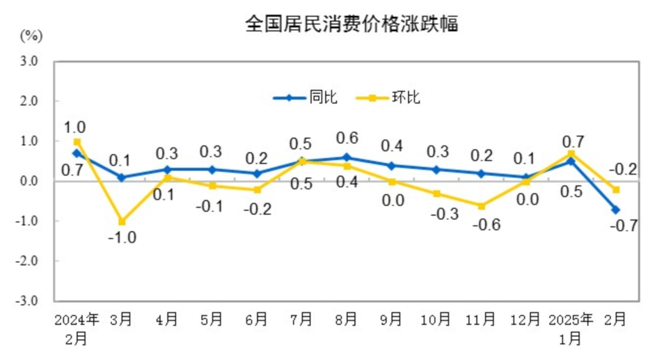 3月9日,国家统计局公布2025年2月物价数据,显示CPI同比涨幅为-0.7%,PPI同比下降2.2%。