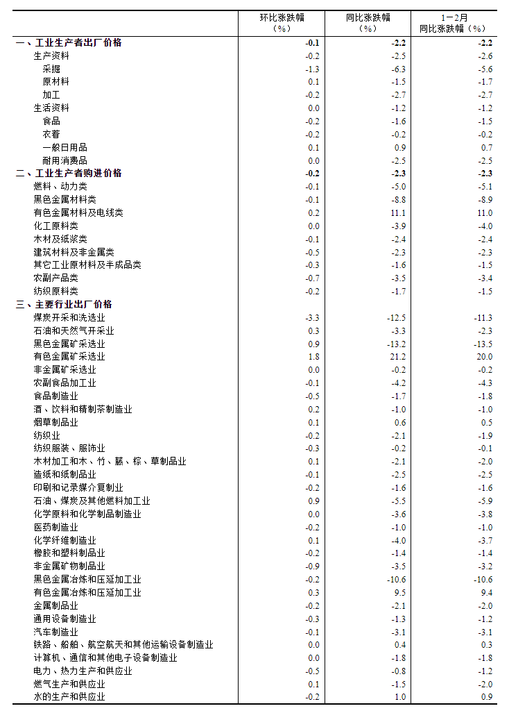 2月份,生产资料价格下降2.5%,生活资料价格下降1.2%。采掘、原材料、加工工业价格均有所下降,而一般日用品价格上涨0.9%。有色金属材料及电线类价格则显著上涨11.1%。