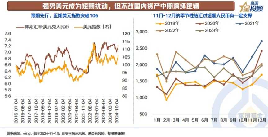然而,短期汇率波动并不能改变国内资产的中期逻辑。这主要基于两点:一是汇率的本质是两国经济状态的比值,尤其是在美国一任总统周期内,经济本身的状态更为重要,汇率波动进一步凸显了稳定经济的重要性;二是从年底这个时间节点来看,11月至12月是外贸企业结汇的高峰期,这将对短期汇率过快交易提供一定的支撑。