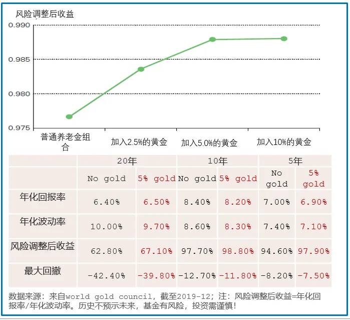 虽然今年黄金价格屡创新高,且短期金价正在面临震荡调整,但如果想要在配置中加点“金”,哪怕比例不高,5%-10%即可,也可以起到降低波动、提升收益的效果。根据世界黄金协会的数据,加入黄金资产后,养老金组合在波动率、最大回撤、风险调整后收益等多项指标上均有显著提升,这正是多资产配置的魅力所在。
