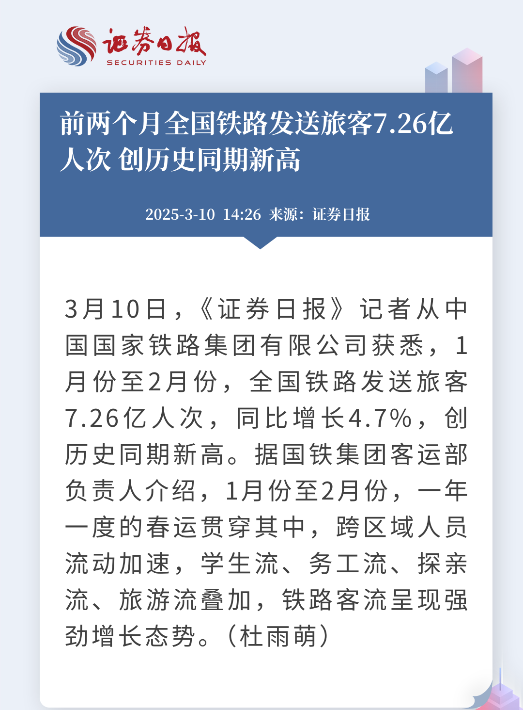 3月10日,据国铁集团数据,1月份至2月份全国铁路发送旅客7.26亿人次,同比增长4.7%,创历史同期新高。春运期间跨区域人员流动加速,铁路客流强劲增长,反映国内经济活跃。