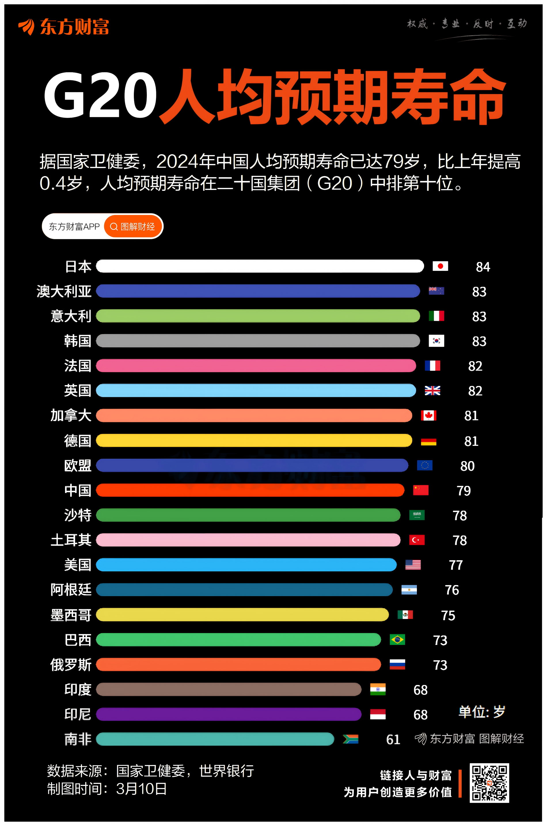据国家卫健委3月9日公布的信息,2024年中国居民预期寿命已达79岁,比2023年提高0.4岁,提前实现了“十四五”国民经济和社会发展规划目标要求。这一成就反映了中国健康水平的显著提升,在G20国家中排名第十,健康改善备受瞩目。在G20国家中,人均寿命超过80岁的多为发达国家/地区。数据显示,截至2022年,日本的人均预期寿命最高,达84岁;澳大利亚、意大利、韩国紧随其后,均为83岁。此外,法国、英国、加拿大、德国等的人均预期寿命也超过了80岁。中国在这一群体中虽然排名第十,但提升速度令人瞩目。
