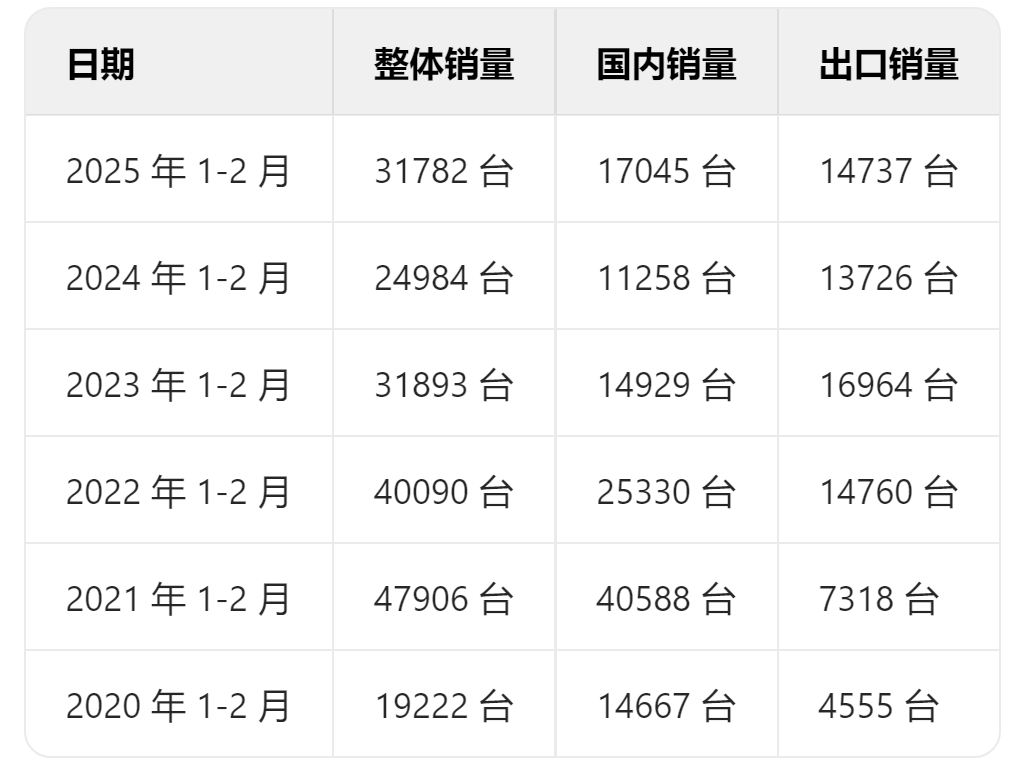 据中国工程机械工业协会统计,2月挖掘机销量19270台,同比增长52.8%,内销增幅近翻番。1-2月累计销售31782台,同比增长27.2%,内销增长51.4%,出口增长7.37%。