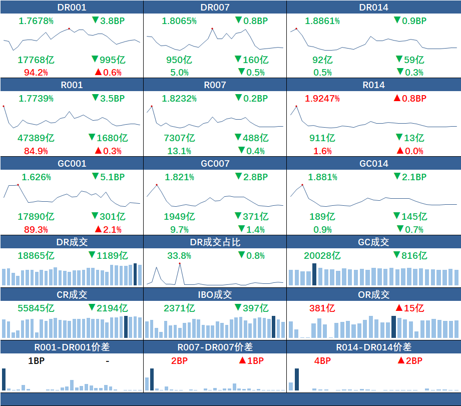 银行间质押式回购市场方面,各品种利率普遍小幅下滑,隔夜品种跌回1.8%以内。具体来看,DR001、R001加权平均利率分别下行3.8BP、3.5BP至1.7678%、1.7739%,成交额分别减少;DR007、R007加权平均利率分别下行0.8BP、0.2BP至1.8065%、1.8232%,成交额亦有所减少。货币市场整体呈现宽松态势。
