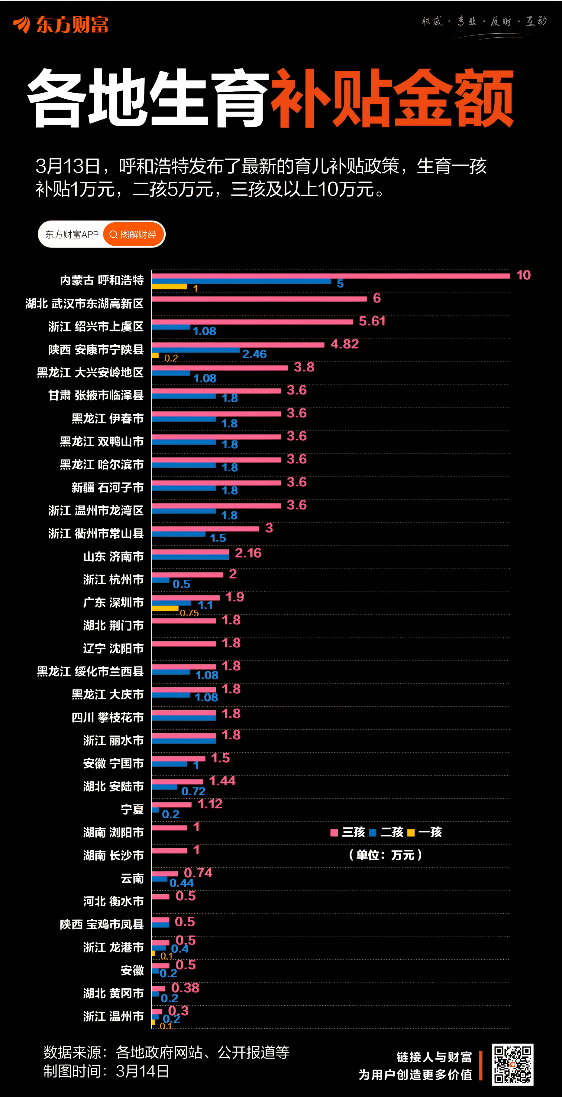 自三孩政策实施以来,各地纷纷推出“生娃发钱”政策。据不完全统计,呼和浩特此次发布的生育补贴金额,在已公布的三十余个相关规定中位居首位。从补贴力度来看,三孩补助金额最多,其次是二孩,一孩补助相对较少。例如,湖北省武汉市东湖高新区对三孩补贴6万元,而陕西安康市宁陕县三孩补贴高达4.82万元,约为二孩的两倍,一孩补贴则仅为2000元。整体来看,一个三孩家庭累计可获得的生育补贴金,在不同地区从5000元到16万元不等。