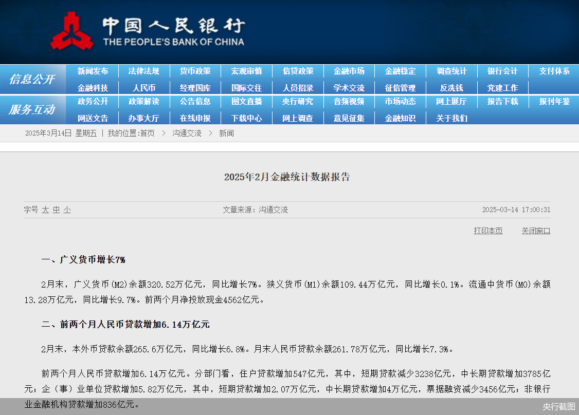 最新一期金融数据出炉,释放多个信号。3月14日,人民银行官网发布的2025年2月金融统计数据报告显示,M2增速基本稳定,社会融资规模增速加快,贷款规模合理增长,信贷结构出现不少亮点。尤其是,2月份企业新发放贷款利率约3.3%,个人住房新发放贷款利率约3.1%,贷款利率保持在历史低位水平。这些数据显示出我国金融体系的稳健运行和对实体经济的持续支持。