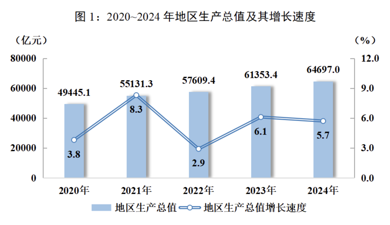 3月17日,四川省统计局公布了2024年四川省国民经济和社会发展统计公报。据地区生产总值(GDP)统一核算初步结果,2024年四川省GDP达到64697.0亿元,同比增长5.7%。