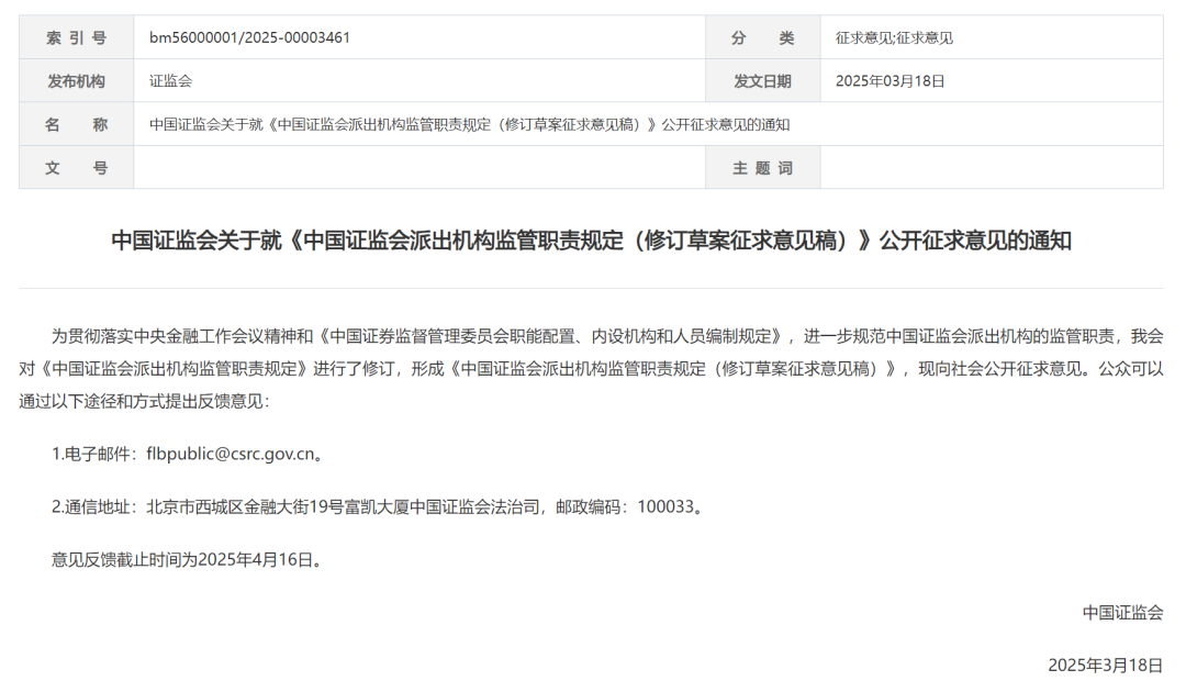3月18日,中国证监会发布通知,为贯彻落实中央金融工作会议精神,对《中国证监会派出机构监管职责规定》进行了修订,形成征求意见稿。主要修订内容包括强化派出机构主体责任、明确监管职责范围、加强风险防范和处置、新增其他重要职责等。