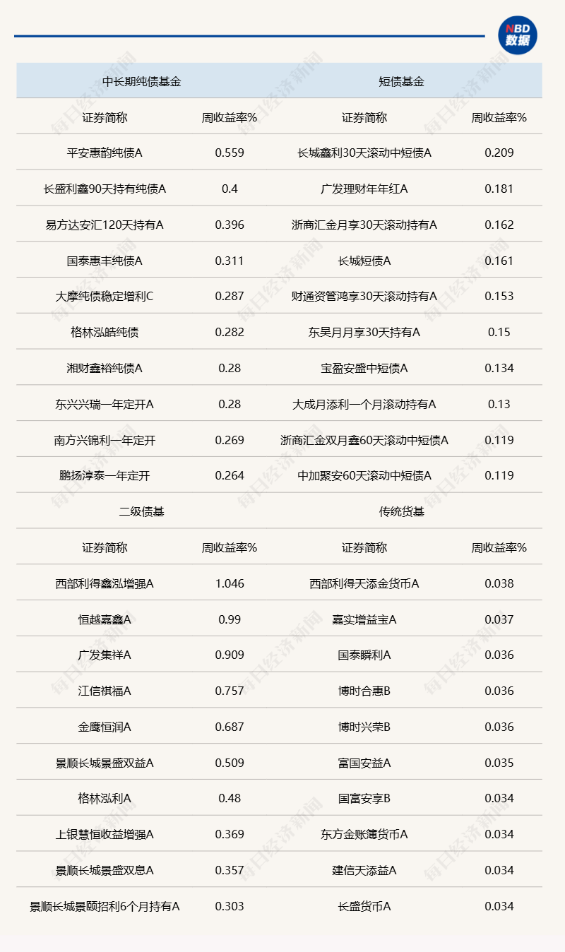 基金收益率方面,中长期纯债基金指数上周涨幅收窄至0.06%,短债基金指数涨幅亦收窄至0.04%。平安惠韵纯债A、长城鑫利30天滚动中短债A分别成为中长期纯债基金、短债基金中周业绩最佳的基金。