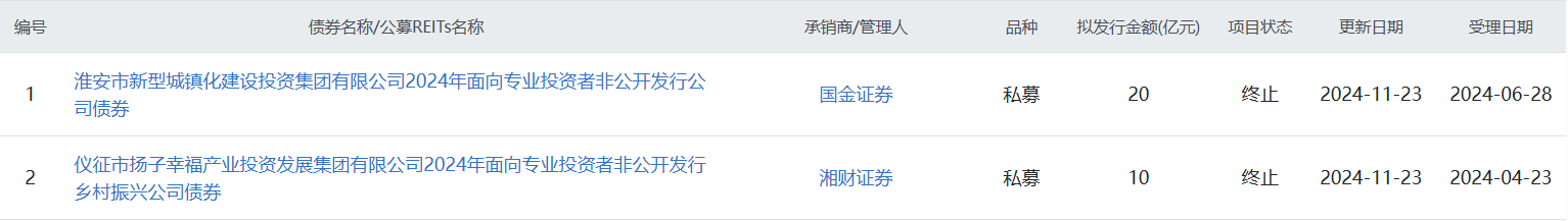 另一笔被终止审核的债券项目来自仪征市扬子幸福产业投资发展集团有限公司,该公司原计划于2024年面向专业投资者非公开发行乡村振兴公司债券,发行金额为10亿元,承销商/管理人为湘财证券。该项目受理日期为2024年4月23日,同样在历经审核后未能获得通过。