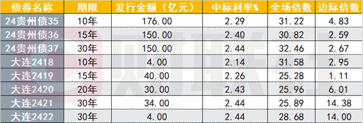 11月21日,本轮用于“置换隐性债务”的特殊再融资专项债中,首批10年以上的超长债成功发行。从发行结果来看,市场反响热烈,全场投标倍数在25倍至33倍之间,边际倍数普遍不高。最终票面定价合理,30年贵州债高于国债15个基点,10年、15年贵州债高于国债19个基点;30年大连债高于国债15个基点,15年、20年大连债高于国债5-11个基点。