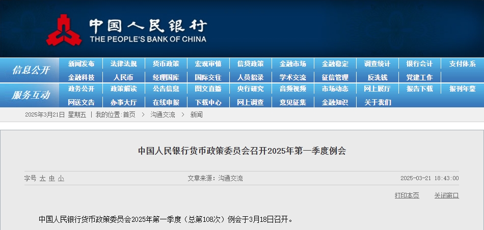 中国人民银行官网今日发布消息,中国人民银行货币政策委员会2025年第一季度(总第108次)例会于3月18日召开。
