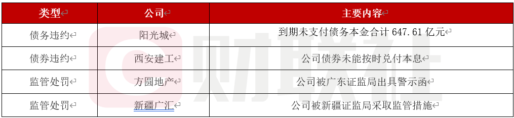 阳光城集团到期未支付债务本金高达647.61亿元,西安建工债券违约计划召开持有人会议,方圆地产及相关责任人遭广东证监局警示,新疆广汇集团及子公司收监管措施决定书。