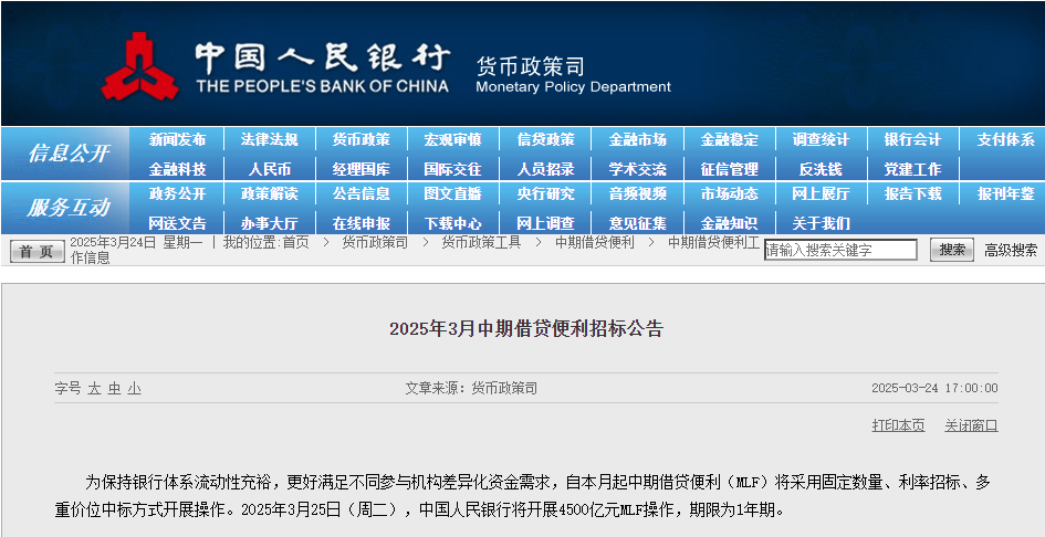 2025年3月25日(周二),中国人民银行按计划开展了4500亿元的MLF操作,期限为1年期。此举进一步稳定了市场预期,增强了市场信心。