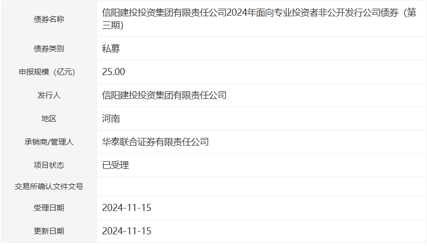 信阳建投投资集团2024年非公开发行公司债券(第三期)项目获深交所受理,拟发行金额25亿元,主体信用评级为AA+,展望稳定。
