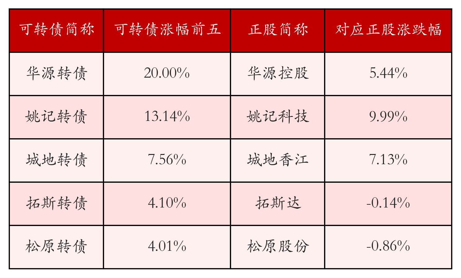 在可转债市场中,今日共有533只可转债实现交易,其中36只转债上涨,1只持平,496只下跌。涨幅榜上,表现最为亮眼的是华源转债(128049),收盘大涨20.0%;姚记转债(127104)紧随其后,涨幅达到13.14%;城地转债(113596)也表现不俗,上涨7.56%。此外,共有10只可转债涨幅超过2%。