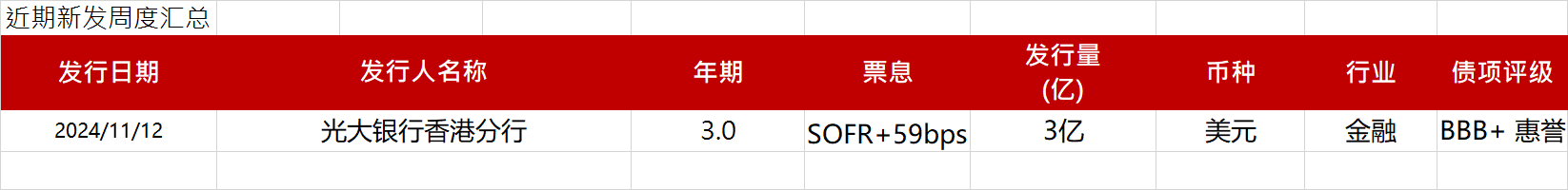近期,一级市场活跃,光大银行香港分行积极参与美元债新发,为市场注入新动力。在二级市场,中资美元债投资级市场上周整体表现平稳,国企板块略有波动,中石油走阔约1bps;科技板块表现稳健,百度收窄2bps;金融板块方面,中国银行走阔约4bps。