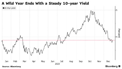 截至2023年最后一个交易日收盘,10年期美债收益率报3.879%,仅略高于2022年的收盘水平3.875%。