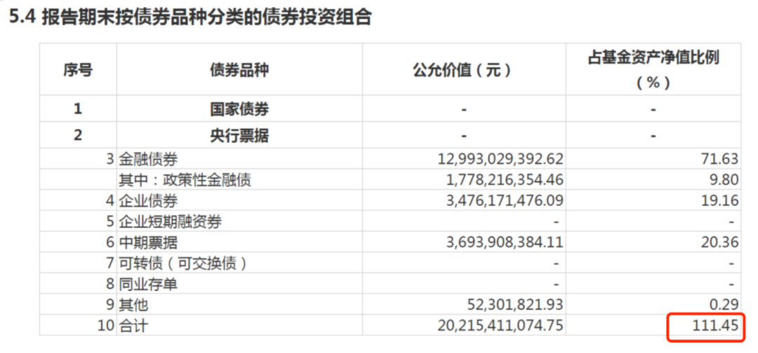 了解债基杠杆率其实很简单,基金的每期定期报告中都会披露。在“报告期末按债券品种分类的债券投资组合”章节中,即可找到债券投资组合公允价值合计占基金资产净值比例。例如,富国信用债2023年二季报显示,二季度末的杠杆率为111.45%。