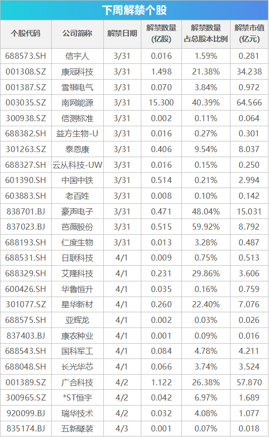 Wind数据统计显示,下周(3月31日-4月4日)共有25家公司限售股解禁,合计解禁20.73亿股,解禁总市值高达216.54亿元。3月31日为解禁高峰期,南网能源、广合科技、康冠科技等公司解禁市值居前。