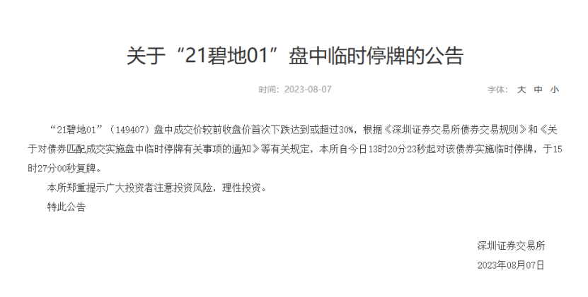 8月7日,碧桂园(02007.HK)及其子公司碧桂园服务(06098.HK)在港交所的股价大幅下跌,跌幅均超过7%,在地产股中跌幅居前。同时,碧桂园地产旗下的多只境内债券也集体受挫,其中“21碧地01”盘中跌幅超过33%,并触发临时停牌,最终收盘下跌37.78%,其余多只债券也均出现不同程度的下跌。
