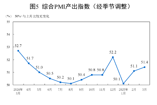 3月份,综合PMI产出指数为51.4%,较上月增长0.3个百分点,表明我国企业生产经营活动总体扩张加快。