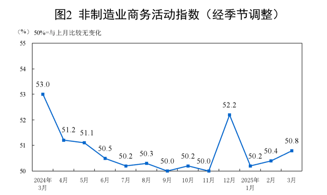数据显示,3月份非制造业商务活动指数为50.8%,较上月上升0.4个百分点,非制造业扩张步伐加快。