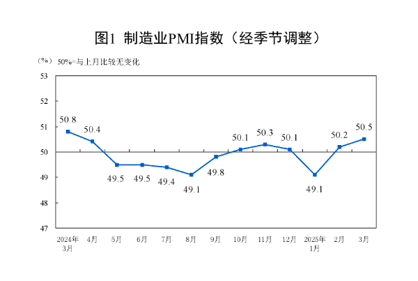 国家统计局3月31日发布的数据显示,3月份制造业采购经理指数(PMI)为50.5%,较上月上升0.3个百分点,连续两个月站稳荣枯线上。