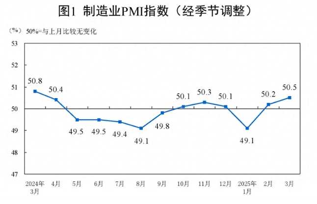 国家统计局服务业调查中心、中国物流与采购联合会发布的数据显示,3月份中国制造业采购经理指数(PMI)为50.5%,较上月上升0.3个百分点,连续2个月运行在扩张区间,创下自2024年4月以来近一年新高。