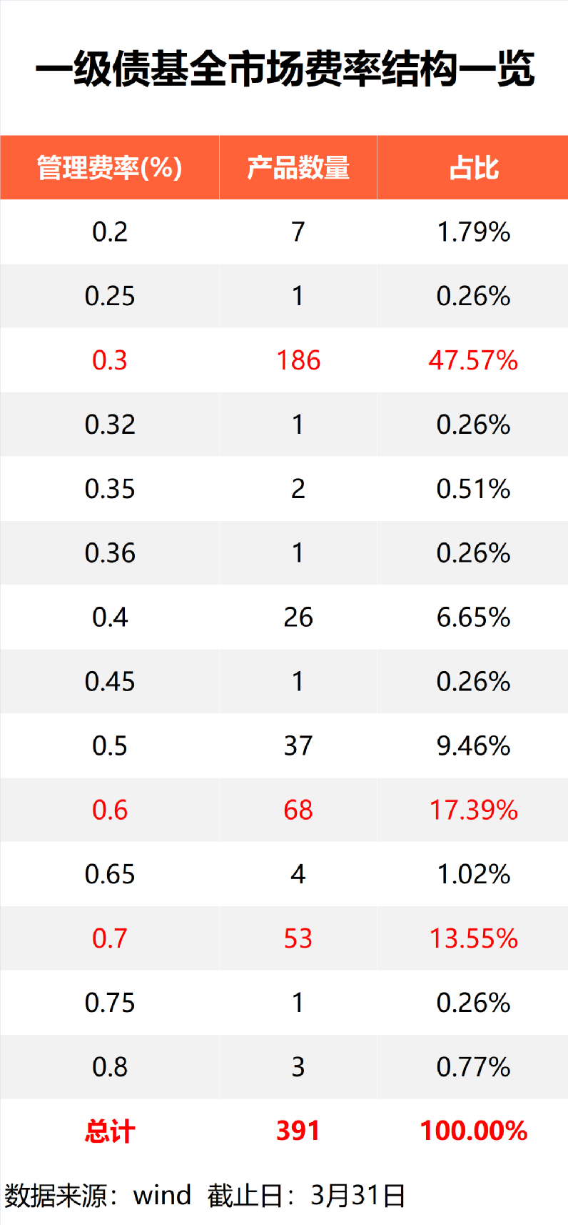 从产品类型看,一级债基降费数量达到10只,在19只降费债基中占比过半。目前全市场391只一级债基平均年管理费率0.44%,其中0.3%管理费的产品数量最多,接近全市场半壁江山。