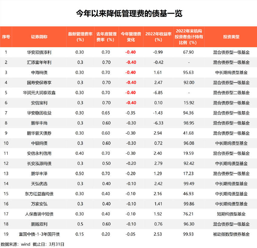 随着2023年一季度的圆满结束,面对去年债基收益未达预期、机构资产再配置压力增大,以及增厚投资收益和同质化竞争的双重挑战,今年年初已有19只债券型基金陆续降低管理费,以吸引投资者。其中,一级债基占比过半,成为降费揽客的“主力军”。