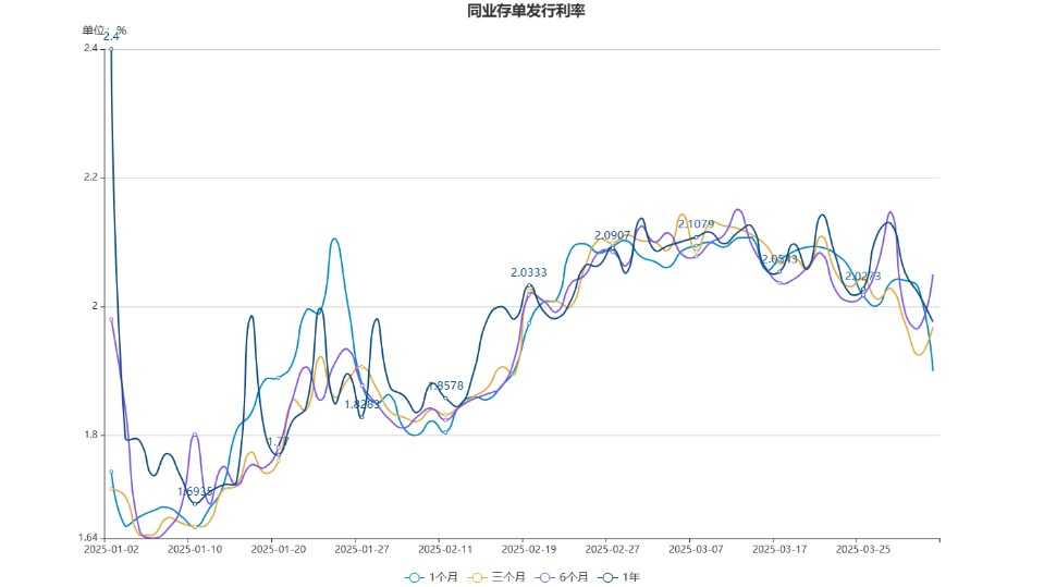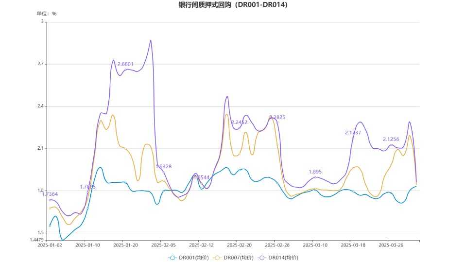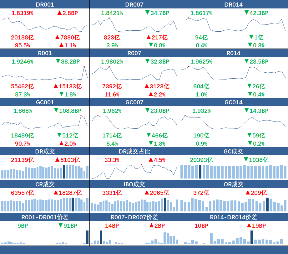 银行间质押式回购市场方面,跨季后隔夜、7D、14D资金利率均降至2%以下。具体来看,DR001、R001加权平均利率分别变动至1.8319%、1.9246%,成交额分别大幅增加;DR007、R007加权平均利率分别下行,报1.8421%、1.9802%,成交额有所增长;DR014、R014加权平均利率下行,报1.8617%、1.9625%,成交额略有减少。